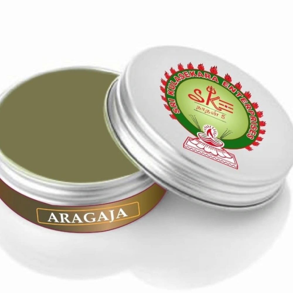 Natural aragaja is created by finely grinding a blend of aromatic herbs and resins, which typically includes ingredients like sandalwood, camphor, lotus seeds, and black kumkum. This finely ground mixture is then combined with water to form a sacred paste, traditionally used for religious rituals and as a sacred mark